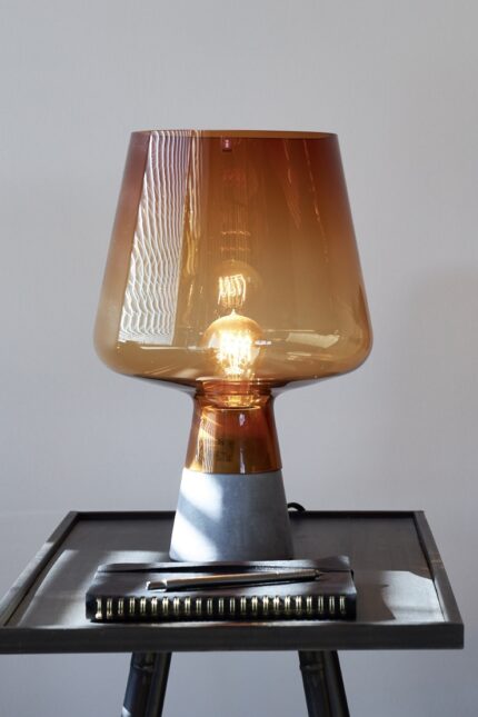 iittala Lampe Leimu 300 x 200cm kupfer Leimu des Designers Magnus Pettersen wurde von der modernen Architektur inspiriert, insbesondere der Kombination aus Beton und Glas. Es zeigt ein wunderschönes Zusammenspiel von warmen und kühlen Elementen in dem, was Pettersen als „industriellen Luxus“ bezeichnete. Leimu erinnert an eine Flamme und schafft einen auffallend eleganten Ausgleich zwischen Feingefühl und Stabilität. Das geradlinige Design verfügt über einen zarten mundgeblasenen Glasschirm und einen robusten Betonsockel. Um die richtige Balance zwischen Beton und Glas zu erreichen, waren die besten Experten der Iittala Glasmanufaktur gefragt. Die handgefertigte Leimu Lampe fühlt sich schön glatt an und ihr besonders sanftes Licht sorgt für einen behaglichen Innenraum. Der Farbton Kupfer erzeugt einen goldenen Glanz. Ein moderner Klassiker und Gewinner des angesehenen iF Design Awards.