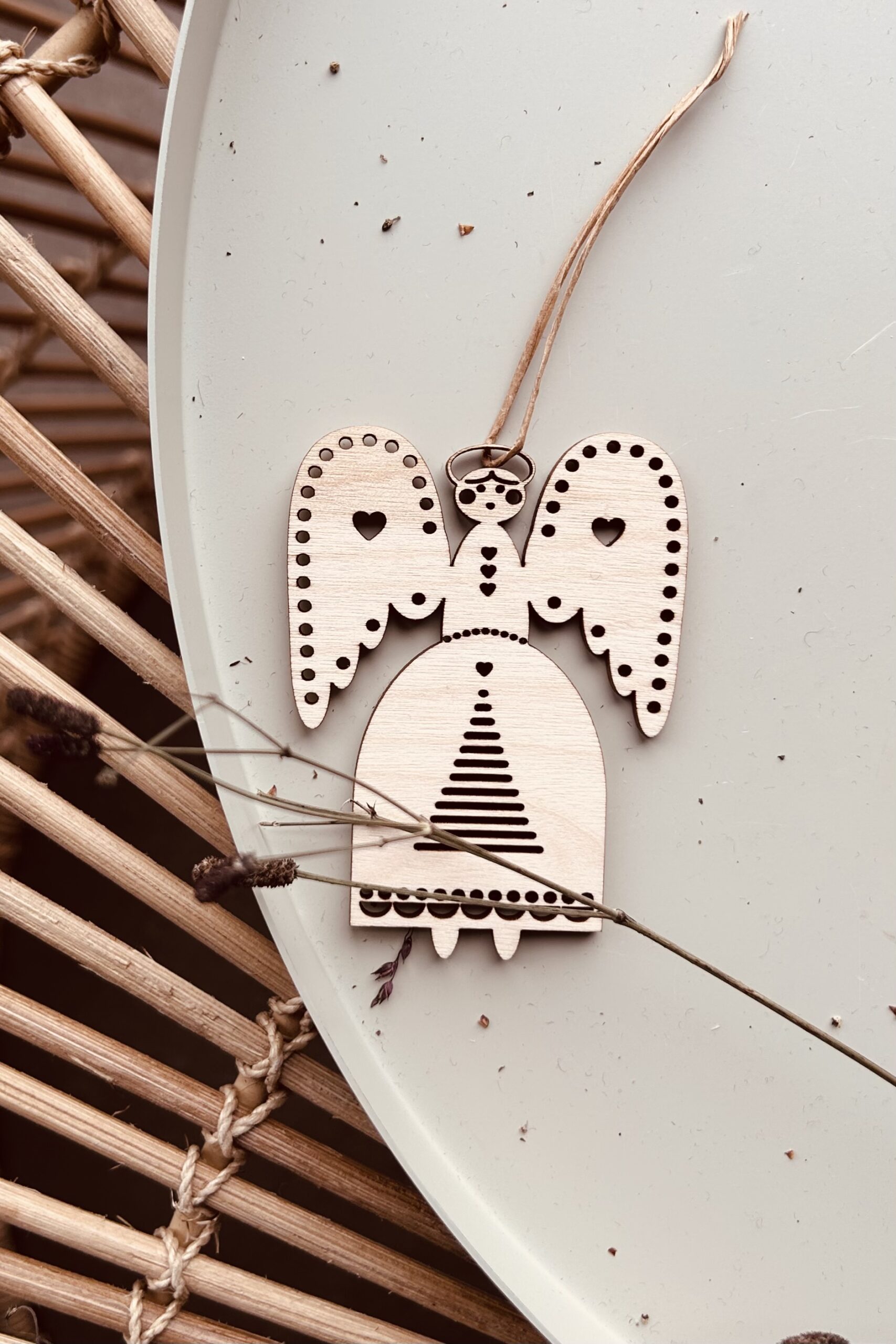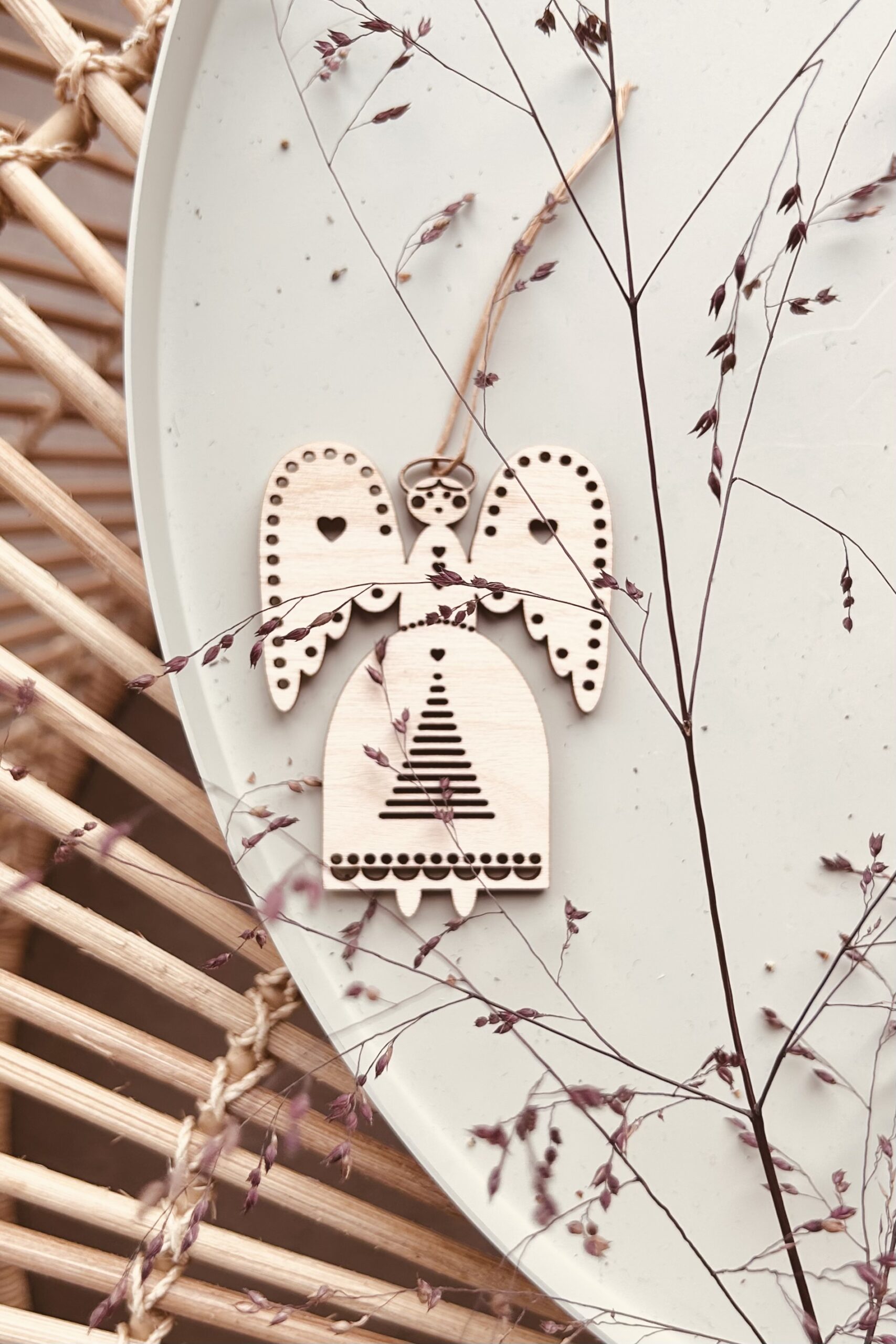 Einzigartiger Engel im skandinavischen Folkart Style, der traditionelle Muster und Formen der nordischen Kultur widerspiegelt.