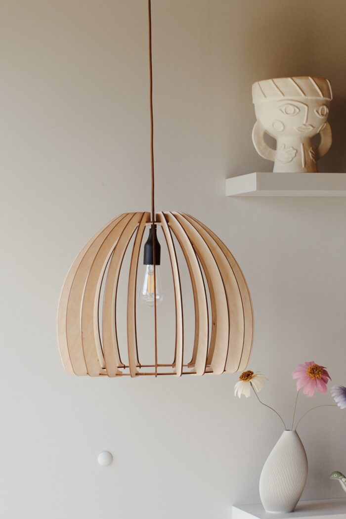 Ein schlichter Hingucker mit Charakter: Unser Lampenschirm Ole wird aus 4 mm starkem Birkensperrholz gefertigt und verbindet natürliche Materialien mit einem modernen, luftigen Design.